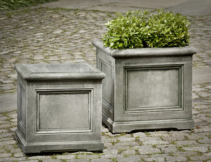 The Orleans planters are traditional coffered square boxes with a heavy lip. The base of the box is enhanced by a notched leg.